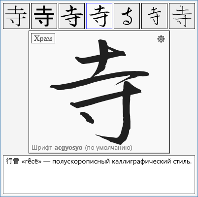Показаны начертания иероглифов в различных шрифтах и каллиграфических стилях.