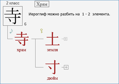 Для каждого иероглифа выводится интерактивная схема его декомпозиции на радикалы.
