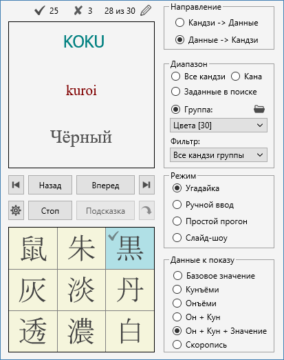 Для проверки знания иероглифов, каны и слов реализован дрилл с множеством разнообразных функций. Группы иероглифов и слов для работы в дрилле можно создавать и редактировать по своему усмотрению.