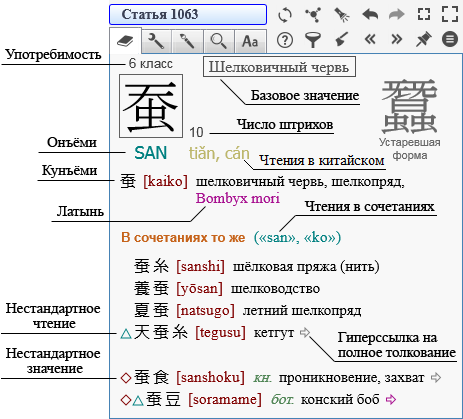 Снабжен подробной справкой и каждый радикал (иероглифический элемент), которых в ЯРКСИ насчитывается 2656.