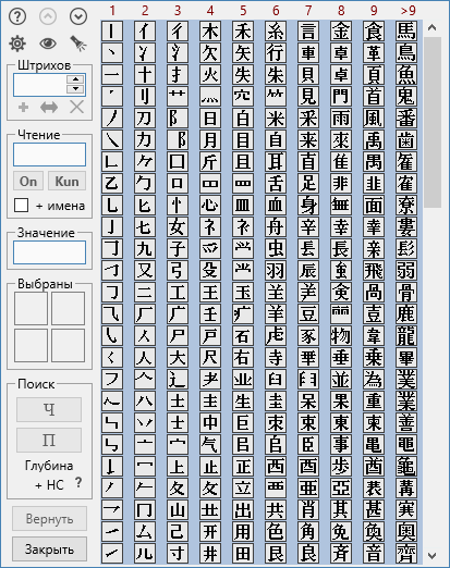 Принятая в ЯРКСИ система поиска иероглифов основана на выборке радикалов (графических компонентов) из специально разработанной таблицы, содержащей 634 радикала.